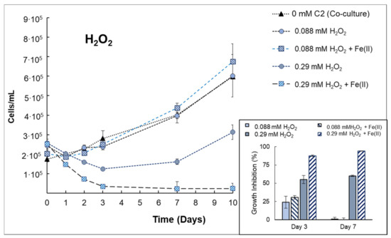 Growth curves of Anabaena sp. in co-culture with V. alginolyticus for single H2O2 or H2O2 + Fe(II) treatments. Inset: Specific growth inhibition (%) obtained at day 3 or 7 for Anabaena sp. exposed to H2O2 or H2O2 + Fe(II) treatments.