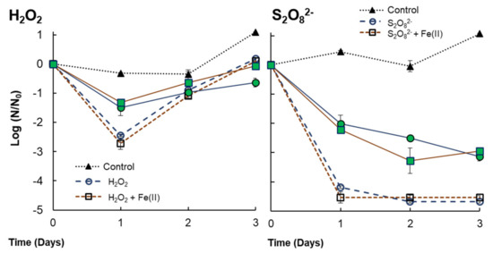 Inactivation of V. alginolyticus for single H2O2 or S2O82− (+ Fe(II)) treatments [H2O2] = 0.29 mmol/L; [S2O82−] = 3 mmol/L; [Fe(II)]= 18µmol/L. Filled markers indicate co-cultures with Anabaena sp., while empty markers indicate single cultures of V. alginolyticus.