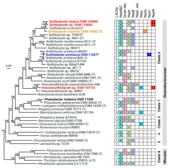 - Petersen, J.; Brinkmann, H.; Pradella, S. Diversity and evolution of repABC type plasmids in Rhodobacterales. Environ. Microbiol. 2009, 11, 2627–2638. [Google Scholar] [CrossRef]