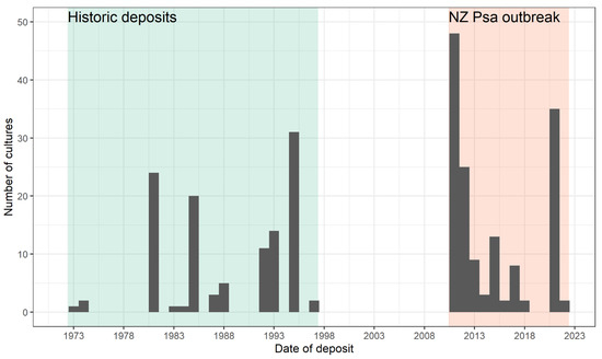 Deposits of Pseudomonas cultures isolated from New Zealand kiwifruit in the ICMP culture collection. A 13-year gap in deposits before the 2010 outbreak limited the use of the collection in determining the timeline of the origin of the incursion.