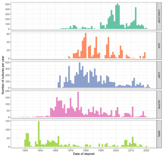 A histogram showing the dates of strain deposit in five global phytopathogen culture collections: CIRM-CFBP, DAR, ICMP, NCPPB, and NRRL. The collections have different establishment dates reflected in the first deposit of cultures, but all show a pattern of a reduction in deposits in recent decades from historical patterns.