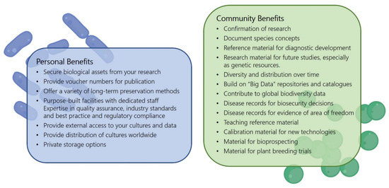 In general, we strongly encourage scientists to deposit their important resources in public culture collections, where they will be made available long term for the benefit of the whole scientific community. Because the quality of the resources is dependent on the quality of the associated data, depositors are also strongly encouraged to transmit the most accurate and complete data, even if these data do not appear to be important at the time of deposit. This may seem like additional work for research teams, but there are benefits and incentives for researchers to deposit their strains with a culture collection, which they may find are worth the effort (see Figure 4).