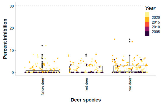 Results of the pseudoneutralization point assay are shown by year and deer species. Horizontal dashed line indicates the assay cutoff of the cPass SARS-CoV-2 Neutralization Antibody Detection Kit as 30% inhibition.