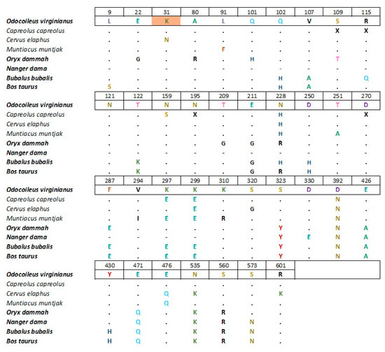 Alignment of the ACE2 receptor among deer and related bovids showed that apart from K-N substitution in the red deer relative to white-tailed deer, none of the sequenced deer species had any substitutions that distinguished them from SARS-CoV-2-susceptible cervid species or other susceptible mammals (Figure 2 and Figure S1).