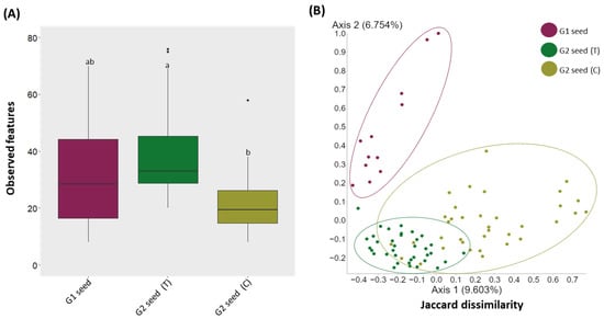 Alpha (observed features) and β-diversity (Jaccard dissimilarity) analyses of the seed microbiota of G. clandestina between G1 seed and G2 (T and C) seed. (A) “Box-and-Whiskers” plots visualize the observed features for G1 seed and G2 (T and C) seed. Significant differences (p ≤ 0.05) were assessed by the Kruskal Wallis pairwise test and are indicated by the lower-case letters. (B) PCoA plots showing the distances between the bacterial community composition of G1 and G2 (T and C) seed. Significant differences in bacterial composition were tested using the ANOSIM pairwise test. Different colours of the bars (A) and points (B) represent the G1 and G2 (T and C) seed represent the plant organs for both soil treatments (T and C).