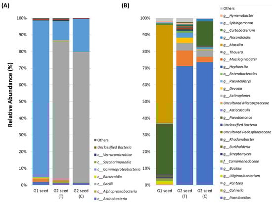 Relative abundance of G. clandestina microbiomes across G1, G2 (T) and G2 (C) seed at the class (A) and genus level (B). Taxa occurring with less than 0.1% relative abundance are shown as “Others”.