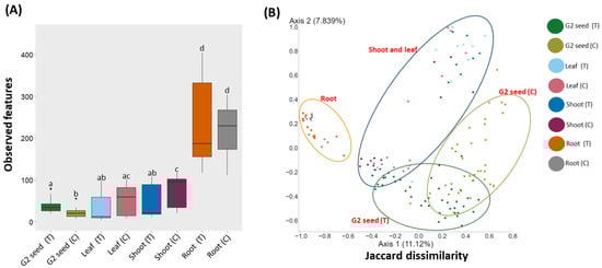 Alpha- (observed features) and β-diversity (Jaccard dissimilarity) analyses of G. clandestina plant organs for plants grown in two soil treatments (T and C). (A) “Box-and-Whiskers” plots visualize the observed features for plant organs. Significant differences (p ≤ 0.05) were assessed by the Kruskal Wallis pairwise test and are indicated by lower-case letters. (B) PCoA plots showing the distances between the bacterial community composition of G1 plant organs and G2 seed when grown in two soil treatments (T and C). Significant differences in bacterial composition were tested using the ANOSIM pairwise test. Different colours of the bars (A) and points (B) represent the G1 plant organs and G2 seed when grown in two soil treatments (T and C).