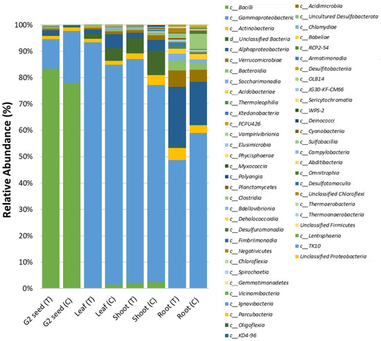 The recruitment and distribution of the original G. clandestina microbiome across G1 plant organs (root, shoot, leaf and seed) was found to be influenced by soil type. The most prominent bacterial class in G1 plant organs, except G2 seed in each treatment, was Gammaproteobacteria, accounting for 48.5–92.8% of the ASVs abundance (Figure 6). The major difference between the microbiome distribution was contributed by class Bacilli in the G2 seeds of both treatments (G1 (T and C), which accounted for 78–83.3%, whilst in other organs, Bacilli only accounted for 0.2–2.4%. In G1 (T) plants, roots were the most microbially-diverse plant organs, accounting for 44 classes, followed by G2 seed, accounting for 37 classes. Shoot and leaf microbiomes comprised of 29 and 26 classes, respectively. In G1 (C), roots also dominated the microbiome with 43 classes followed by shoots consisting of 38 classes, with leaf and G2 seed accounting for 33 and 25 classes, respectively (Figure 6). The five most dominant bacterial classes were identified across different plant organs for each treatment. In the G1 (T) plants, the leaf was mainly dominated by Gammaproteobacteria (93%), “Unclassified Bacteria” (1.9%), Alphaproteobacteria (1.4%), Actinobacteria (1.3%) and Verrucomicrobiae (0.7%). The G1 (T) shoots contained Gammaproteobacteria (84.7%), “Unclassified Bacteria” (5.8%), Bacilli (2.3%), Actinobacteria (2.2%) and Alphaproteobacteria (1.9%). Whilst G1 (T) roots were comprised of Gammaproteobacteria (48.5%), Alphaproteobacteria (22.6%), Verrucomicrobiae (6.1%), Actinobacteria (4.7%) and Bacteroidia (3.9%). Comparatively, G2 (T) seed was dominated by Bacilli (83.3%), Gammaproteobacteria (11.2%), Alphaproteobacteria (1.6%), Actinobacteria (1.2%) and Verrucomicrobiae (0.6%) (Figure 6 and Supplementary Table S3). For G1 (C) plants, the leaves were mainly occupied by Gammaproteobacteria (83.2%), Alphaproteobacteria (5.3%), “Unclassified Bacteria” (4.8%), with Bacilli (1.5%) and Actinobacteria (1.5%) making up the balance. The distribution in G1 (C) shoots was Gammaproteobacteria (74.7%), “Unclassified Bacteria” (9.3%), Alphaproteobacteria (4.1%), Actinobacteria (3.8%) and Bacilli (2.5%); while in G1 (C) roots, Gammaproteobacteria (58.6%), Alphaproteobacteria (16.3%), Clostridia (5.7%), Verrucomicrobiae (4.6%) and Actinobacteria (2.9%) were prevalent. As mentioned previously, G2 (C) seed was dominated by Bacilli (78%), with the remainder of the class distribution being Gammaproteobacteria, (19.7%), Actinobacteria (1.3%), “Unclassified Bacteria” (0.3%) and Alphaproteobacteria (0.3%) (Figure 6 and Supplementary Table S3).