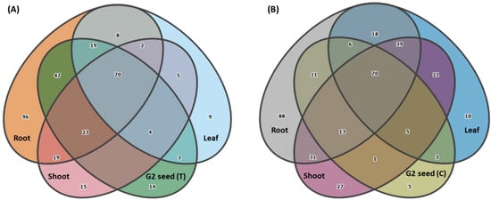 Venn diagrams showing the distribution of bacterial genera across G1 plant organs (root, shoot, leaf) and G2 seed for (A) Treatment G1 (T) and (B) Control, G1 (C).