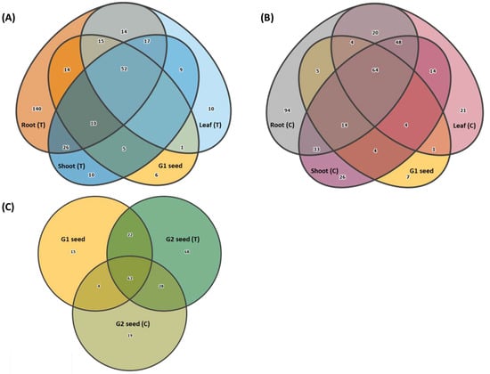Venn diagrams showing the transmission of G1 bacterial genera across G1 plant organs (root, shoot and leaf) for(A) Treatment (T) and (B) Control and (C) G2 seed (T and C).