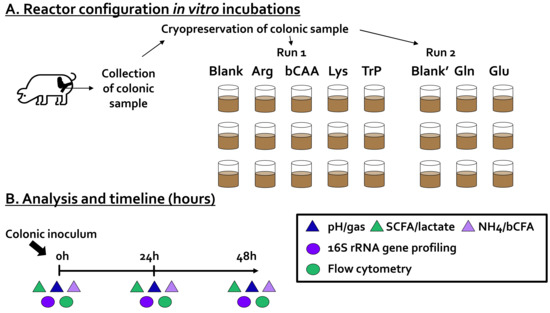The inoculum was derived from a freshly collected sample of the mid-colonic content of a piglet (22.1 kg, 10 weeks of age). The mid-colon refers to a 20-cm section cranial to the end of the centripetal coils of the colon. After weaning, the pig was fed a cereal-soy-based weaner (2 weeks) and starter (4 weeks) diet without antimicrobial growths promoters or probiotics until collection (Table 1 in Van Noten et al., 2020 [24]). After euthanasia, the abdominal cavity of the pig was opened, and the mid-colonic section was clamped with forceps and excised. Its contents were poured into an aseptic container flushed with nitrogen. Immediately hereafter, this sample was mixed in a 15:100 (mass/volume) ratio with anaerobic phosphate buffer (K2HPO4, 8.8 g/L; KH2PO4, 6.8 g/L; sodium thioglycolate, 0.1 g/L; and sodium dithionite, 0.015 g/L). After homogenization (10 min, BagMixer 400, Interscience, Louvain-La Neuve, Belgium) and removal of large particles via mild centrifugation (500 g for 2 min), the inoculum was mixed 1:1 (volume/volume) with anaerobic cryoprotectant (prepared according to Hoefman et al., 2013 [25]), aliquoted and preserved at −80 °C (after flash freezing in liquid nitrogen in an anaerobic workstation (TCPS Ltd., Belgium) with gas atmosphere 80/10/10 N2/CO2/H2). Preparation of aliquots from a single colonic suspension ensured that identical microbial communities could be used throughout different project runs which was important given that the project was performed in two runs. While Arg, bCAA, Lys, and Trp were tested during run 1, Gln and Glu were tested during run two. As will be elaborated in the results section, a blank was run during each of the two runs (blank and blank’) and these two blanks appeared to be highly similar in terms of microbial activity and composition, thus allowing to compare treatment effects of amino acids tested in both runs. To optimally represent the exact treatment effects, the results are presented as the difference between a given treatment versus the corresponding blank of a given project run.