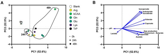 (A) PCA based on microbial metabolic activity at different time points (0 h, 24 h, and 48 h) during the incubation of porcine colonic microbiota in presence of various amino acids versus an untreated control incubation (blank). (B) Loadings of the parameters on which the PCA was based: pH, gas production, and levels of SCFA (acetate, propionate, butyrate, valerate, caproate), bCFA (isobutyrate, isovalerate, isocaproate), lactate and ammonium. PCA = principal component analysis.