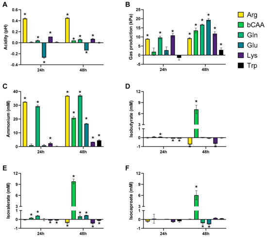 Effect of amino acids on acidity (pH) (A), gas production (kPa) (B), and markers of proteolytic fermentation (ammonium (C) and bCFA (isobutyrate (D), isovalerate (E), and isocaproate (F))) upon incubation with a porcine colonic microbiota (n = 3). The data is presented as the average (±SD) difference versus a corresponding blank incubation. Statistically significant differences are indicated with asterisks (* p < 0.05).