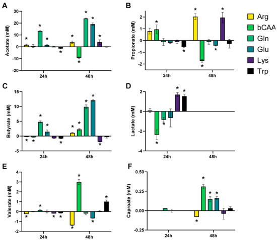 Effect of amino acids on microbial fermentation products (SCFA (acetate (A), propionate (B), butyrate (C), valerate (E), and caproate (F)) and lactate (D)) upon incubation with a porcine colonic microbiota (n = 3). The data is presented as the average (±SD) difference versus a corresponding blank incubation. Statistically significant differences are indicated with asterisks (* p < 0.05).