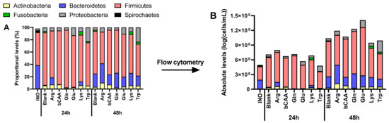 Impact of amino acids on microbial community composition (phylum level) during incubations with a porcine colonic microbiota. Values are the average of three technical replicates (n = 3) and are expressed both (A) as proportional values based on 16S rRNA gene profiling (%), and (B) as absolute values, estimated upon multiplying with total cell counts (cells/mL) (B). INO = inoculum.