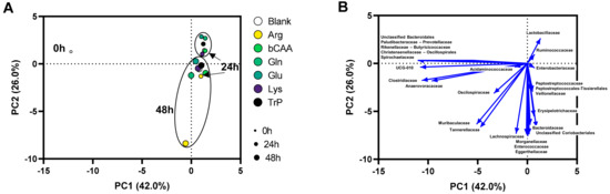 (A) PCA based on microbial community composition (family level; absolute values, estimated upon multiplying with total cell counts (cells/mL)) at different time points (0 h, 24 h, and 48 h) during the incubation of porcine colonic microbiota in presence of various amino acids versus an untreated control (blank). (B) Loadings of the families on which the PCA was based.