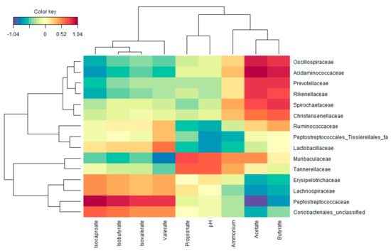 Relationship between bacterial families and pH, gas production, and fermentation products (SCFA, bCFA, and ammonium) in samples collected at the end of the 48 h incubation of the various amino acids with a porcine colonic microbiota. The heatmap was based on the regularized canonical correlation analysis (cutoff = 0.6) between bacterial abundances at family level (proportionate values,) and markers of microbial activity.
