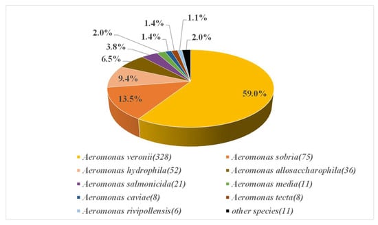 Diversity and proportion of 556 Aeromonas strains. Numbers in parentheses indicate the number of strains, other species correspond to A. encheleia (5) A. popoffii (3) A. dhakensis (1) A. enteropelogenes (1), and A. jandaei (1).