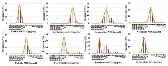 The Kronvall and Turnidge method nonlinear regression fitting distributions of eight drugs against Aeromonas spp. are shown in Figure 2 and Figure 3, respectively. As can be seen, the nonlinear regression fitting distribution results of the eight drugs against Aeromonas spp. obtained by the Kronvall and Turnidge methods were almost identical. The MIC distribution of enrofloxacin against Aeromonas spp. was very wide and multimodal, with two peaks, one large and one small, on the right side. The MICs for doxycycline and florfenicol were widely distributed and showed no obvious bimodal distribution. The MIC distributions for the remaining five drugs were narrow and unimodal. The COWT values can be preliminarily observed with the naked eye, which is the upper limit of the 95% or 97.5% confidence interval of the abscissa of the fitting curve. Erythromycin had the largest COWT value, followed by neomycin and colistin, doxycycline, florfenicol, ceftazidime, trimethoprim–sulfamethoxazole, and enrofloxacin.