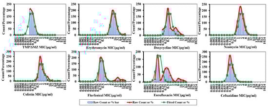 Nonlinear regression fitting distribution of eight drugs to Aeromonas spp. (Turnidge method). (Red “Raw Count or %” represents measured MIC data, green “Fitted Count or %” represents simulated MIC data).