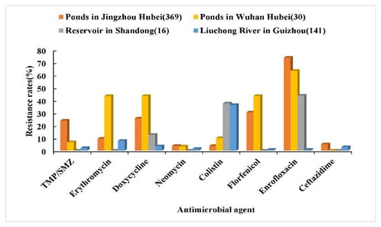 Using the above obtained COWT K and COWT T of Aeromonas spp. against eight drugs, the resistance rate was calculated according to the MIC distributions of Aeromonas spp. against eight drugs in each region. The results are shown in Figure 4 and Figure 5. Aeromonas spp. in culture ponds in Jingzhou City, Hubei Province, had high resistance rates to enrofloxacin, florfenicol, and trimethoprim–sulfamethoxazole. Aeromonas spp. in culture ponds in Wuhan City, Hubei Province, had high resistance rates to enrofloxacin, florfenicol, erythromycin, and doxycycline, but zero resistance to ceftazidime. Aeromonas spp. in the two ponds had the highest resistance rate to enrofloxacin (up to 82.7%), followed by florfenicol. The resistance rates of Aeromonas spp. in Xiashan Reservoir of Shandong Province to five drugs including trimethoprim–sulfamethoxazole, erythromycin, neomycin, florfenicol, and ceftazidime were 0, but the resistance rates of Aeromonas spp. to enrofloxacin and colistin were high. Aeromonas spp. in Liuchong River, Guizhou Province, had a high resistance rate to colistin, but their resistance rates to the other seven drugs were all low.