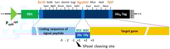 For cloning of the SP coding sequence at the 5′ end of the MCS, restriction enzyme BsrGI can be chosen, whose recognition site is located between the ribosome binding site (RBS) and the corresponding start codon of the following coding sequence, so that the original 5′ end remains intact, resulting in the native N-terminus of the SP. The fusion of the SP coding sequence and the target gene results in the insertion of two amino acids on protein level between SP and target protein (Figure 1). These two residues at the so-called +1 and +2 position relative to the signal peptidase I (SPaseI) restriction site can affect the effectivity of SPase I. It depends on the N-terminal amino acid of the protein (+1) and on the C-terminal residues of the SP itself at positions −3, −2, −1 [10], while the latter are unchanged during the cloning procedure. Furthermore, these two additional +1 and +2 amino acids may influence the properties of the protein, since they remain at the N-terminus of the secreted protein after cleavage of the SP. Hence, the restriction enzyme NgoMIV was chosen, whose in-frame recognition sequence gccggc results in the insertion of the small and uncharged alanine and glycine residues with expectation of the least effect due to steric hindrance or other interactions on the secreted protein. In addition, both amino acids have been described as not negatively influencing the cleavage of the SP by SPaseI [10,38]. At the 3′ end, the in-frame recognition site of AgeI results in the least amino acid residues between protein of interest and His6-tag but all other cleavage sites are also possible, especially for cloning without His6-tag fusion.