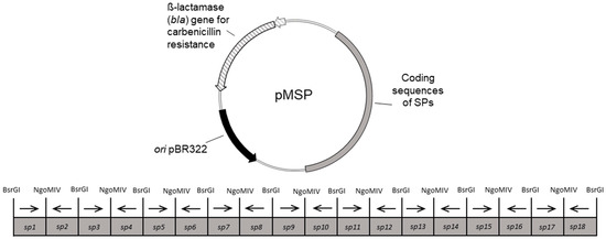In previous publications, the coding sequences of the SPs were often individually amplified by PCR [17,19], which allows for individual mixing of different SPs but also implies a higher workload and higher cost. Here we present a new approach in which the coding sequences of the SPs were located on plasmids separated by restriction sites so that their fast and easy amplification, restriction, and cloning is possible. For this, the coding sequences of the 182 predicted SPs of P. megaterium were arranged on ten multi-signal peptide plasmids (pMSPs) (Figure 2). pMSP1 to pMSP9 each contain 18 and pMSP10 contains 20 coding sequences for SPs. The sequences were sorted by size, so that the longest SP sequences were grouped on pMSP1 going up to pMSP10, which is carrying the shortest sequences (Tables S3–S12) to prevent possible preferential incorporation of long or short sequences into the targeting vector. The SP coding sequences were assembled as cassettes on the plasmids, arranged in alternating orientation so that BsrGI is at the 5′ and NgoMIV at the 3´ end for ligation in correct orientation into the target vector and synthesized by General Biosystems (Morrisville, NC, USA) (Figure 1 and Figure 2).