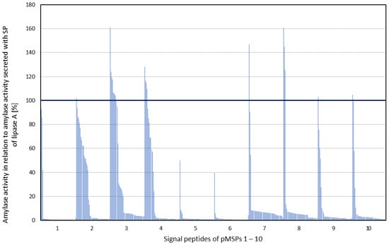 Due to the lack of the outer membrane, Gram-positive bacteria are well suited to the secretion of recombinant proteins directly to the surrounding growth medium, simplifying protein purification [4,5]. N-terminal SPs mediate the translocation across the cytoplasmic membrane, hence different numbers of SPs have been bioinformatically predicted and identified for a range of Gram-positive bacteria. As early as 2000, Tjalsma et al. predicted 180 potential SPs for B. subtilis strain 168, of which 14 were hypothetically assigned to the Tat-dependent and 166 to the Sec-dependent pathway with lengths between 19 and 44 amino acids [38]. Later, 173 of these identified SPs were attributed to the Sec-dependent pathway and tested according to their secretion of different target proteins [17,19]. Additionally, 220 SPs from Bacillus licheniformis DSM 13 together with the 173 SPs of B. subtilis were applied to optimize the secretion of a protease in both organisms [45]. For Lactobacillus plantarum WCFS1, 76 SPs with lengths ranging from 24 to 57 amino acid residues were predicted and applied to improved secretion of a nuclease [21]. For Corynebacterium glutamicum, 405 SP candidates were predicted, of which 90 SPs with lengths between 21 to 53 amino acids were proven to be Sec-dependent [46]. In our study, 182 Sec-dependent SPs from P. megaterium DSM 319 were predicted, which is in the scope of Bacillus species SPs. The lengths of the identified P. megaterium SPs range from ten to 56 amino acids. In 2012, Payne and coworkers described the minimal length of SPs for different species to be 10 amino acids separated in two, five, and three residues for n-, h,- and c-domains of the SP, respectively [13]. Hence, although the minimal length of ten amino acids is shorter than the minimal lengths of the SPs described above, these short SPs were included in our screenings to test their functionality. However, most of these short SPs did not show high secretion capacity of our model enzyme α-amylase (Figure 4) so that they were not further analyzed for the following screening of BmasPGA.