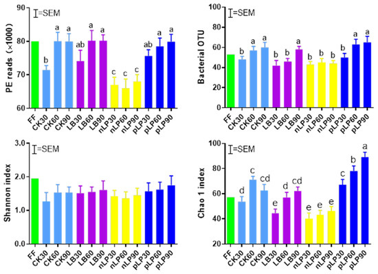The bacterial community index of fresh forage (FF) and control without additives (CK) or with functional LAB (LB, Lentilactobacillus buchneri; nLP, low temperature tolerant Lactiplantibacillus plantarum; pLP, phenyllactic acid-producing Lactiplantibacillus plantarum; each application rate of 106 cfu/g FM), and ensiled for 30 d, 60 d, and 90 d. Bars with different letters (a–e) differ (p < 0.05). OTU, operational taxonomic unit; SEM, standard error of means.