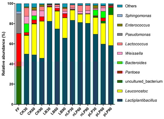The relative abundance of top 10 bacterial genera of fresh forage (FF) and control without additives (CK) or with functional LAB (LB, Lentilactobacillus buchneri; nLP, low temperature tolerant Lactiplantibacillus plantarum; pLP, phenyllactic acid-producing Lactiplantibacillus plantarum; each application rate of 106 cfu/g FM), and ensiled for 30 d, 60 d and 90 d.