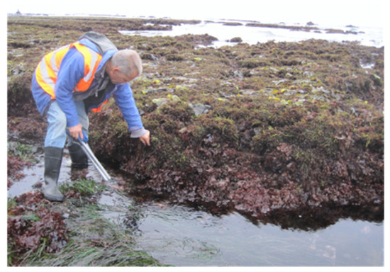 The original site of the Manning and Strain [1] discovery of chlorophyll d is a rocky intertidal zone at Montara State Marine Reserve, Moss Beach, CA, USA (122°30′55.7″ W 37°31′15.3″ N). Water temperatures range from 9–15 °C seasonally, and algal growth peaks in summer, with a particular abundance of red macroalgae (Figure 1).