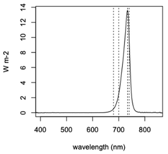 The cultures were incubated at room temperature under a ~730 nm light-emitting diode (LED) light (LED Light Bar 730 nm Far Red, BML Horticulture, Austin, TX, USA), with irradiance over 400–740 nm ranging from 12–22 µmol m−2 s−1. with a 12 h/12 h light/dark cycle. The spectrum for the LED, as measured with a JAZ-A-Irrad absolute irradiance spectroradiometer (Ocean Optics, Inc., Dunedin, FL, USA) at an irradiance location central to the growth chamber, is shown in Figure 2. The exact peak of the LED light bar is at 733.7 nm, and dashed lines demark wavelengths at 680, 700, 733.7, and 740 nm. This shows there is non-zero photon flux below 680 and 700 nm, such that photosynthesis with Chl a-based P680 and P700 could still receive a small amount of photosynthetically active radiation (PAR, 400–700 nm), but otherwise 93% of the 400–740 nm irradiance in photon flux is in the far red, beyond the range of P700. The intensity of the light bar was adjusted such that irradiance over 400–740 nm incident to the samples ranged between 11–22 µmol m−2 s−1.