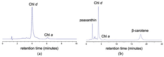 The shoulder that occurs in the HPLC chromatogram about 1 s after the Chl d peak does not occur in HPLC chromatographs of pigments extracts reported in Miyashita, et al. [3] or Larkum, et al. [13]. Further study would be needed to explain if it is Chl d or a degradation product. A. marina strain MBIC11017 also contained trace amounts of phycobiliproteins, a Chl c-like pigments, and α-carotene but not β-carotene [3].