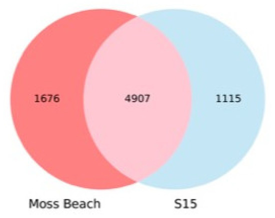 Genome. The high amino acid identity between strains Moss Beach and S15 suggests that both strains belong to the same species, identified as Acaryochloris marina in [24], which is in line with the shared 100% identity between Moss Beach and S15 16S rRNA genes and average nucleotide identity of 98%. While both strains were identified on the Pacific Coast of California, USA, the relatively high number of unique proteins in each strain (Figure 10), and lack of similarity in plasmid-encoded genes distinguishes these two as distinct strains. The S15 strain was isolated from Shelter Cove, Northern California, USA (40.022251° N, 124.0071373° W), while Moss Beach is located southward off the coast of Central California.