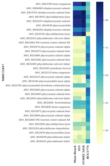 Heatmap displaying phycobiliprotein similarity of Acaryochloris species versus type strain MBIC11017 as the reference. Darker color indicates higher percent amino acid identity to the closest homolog in each of four strains (bottom).