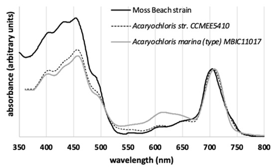 Comparison of the in vivo absorbance spectrum of the Moss Beach strain and those by Duxbury et al. [45] for Acaryochloris marina MBIC11017 and Acaryochoris str. CCMEE 5410. Only MBIC11017 shows the presence of phycobilins, manifested in the absorbance peak around 620 nm.