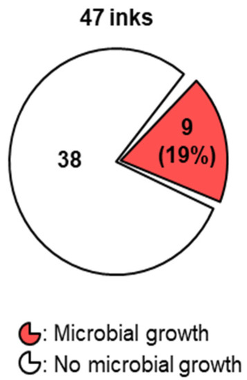 Microbial content of PMU inks. A total of 9 out of 47 PMU inks contained microorganisms.