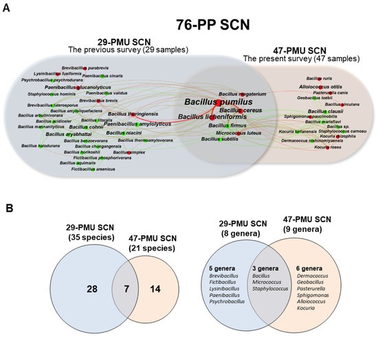 In three surveys, we have identified 79 bacterial isolates from a total of 76 PMU ink samples. They included 50 isolates from 29 PMU inks in the previous two surveys [14,15] and 29 isolates from 47 PMU inks in the present survey. To systematically investigate patterns of species occurrence and species–species co-occurrences, the 79 bacterial isolates were mapped to produce a species-centric co-occurrence network (76-PP SCN) with 49 nodes (bacterial species) and 165 edges (co-occurrence relationships) (Figure 2). As shown in Figure 2, the 76-PP SCN consists of two subnetworks, an SCN (29-PMU SCN) from the previous surveys of 29 PMU inks, which contains 35 nodes (35 species belonging to eight genera) connected by 104 co-occurrence edges and an SCN (47-PMU SCN) from the present survey of 47 PMU inks, which contains 21 nodes (21 species belonging to nine genera) and 69 edges. As revealed in the Venn diagram (Figure 2), the two subnetworks exhibited 28 and 14 exclusive nodes (or noncore species), respectively, and 7 shared nodes (core species) and, at the genus level, five and six noncore genera, respectively, and three core genera (Figure 2B). Conclusively, 49 bacterial species have been identified as bacterial contaminants of PMU inks, and, among them, 14 species belonging to six genera were newly identified in the present survey.