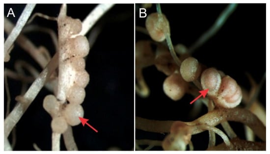 Red arrows point (A) Non-functional nodules generated in soil B3. (B) Functional nodules in soil B1 (40× magnification).