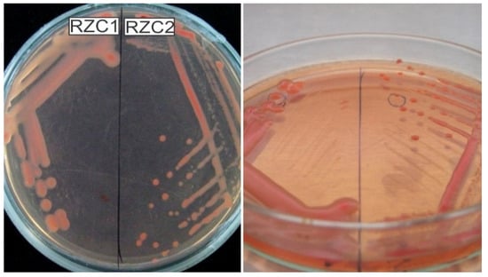 (Left): Isolation plate where the strain RZC1 is clearly differentiated from the strain RZC2. (Right): Convex elevation and pink color of rhizobial strains.