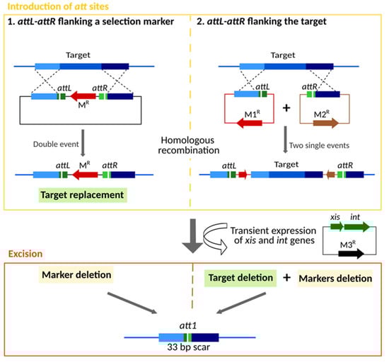 Principle of pSAM2 SSR system and examples of its application (schematic representations not to scale). The SSR system requires cis-acting elements (attL and attR sites) and trans-acting elements (xis and int genes). First, the att sites are introduced in the genome via homologous recombination. The attL and attR sites are integrated in the genome by (1) a double event of homologous recombination in which the target is replaced by an excisable cassette/marker; or (2) two single events of homologous recombination after which the target is flanked by the att sites. Then the xis and int genes are introduced and temporarily expressed to perform the excision of the region flanked by attL-attR sites.