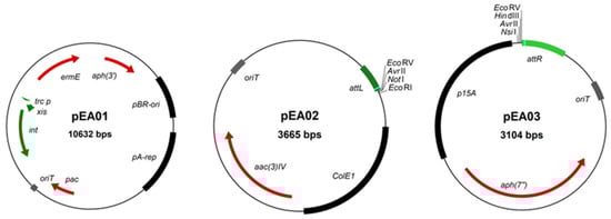 For transient expression of the int and xis genes in Amycolatopsis, we constructed a plasmid relying on the short form of the pA387 replicon contained in pRL60 [29] for replication in Amycolatopsis. If fact, pRL60 has been reported to be unstable in the absence of a selection pressure [42]. The presence of the origin of transfer oriT allows the interspecific transfer of the plasmid from E. coli strain to Amycolatopsis species by conjugation, as widely performed in actinobacteria. In our plasmid, three antibiotic resistance genes are present, conferring kanamycin, erythromycin or puromycin resistance, allowing its selection in various Amycolatopsis genetic backgrounds. The kanamycin marker is used for selection in E. coli strains. The xis and int genes are placed under the control of the promoter trcp, a promoter that efficiently expresses these genes in Streptomyces spp [25]. The resulting plasmid possessing all these features was called pEA01 (Figure 2). This plasmid is available from the Addgene repository (ID 170766).
