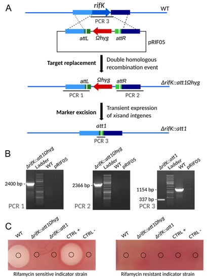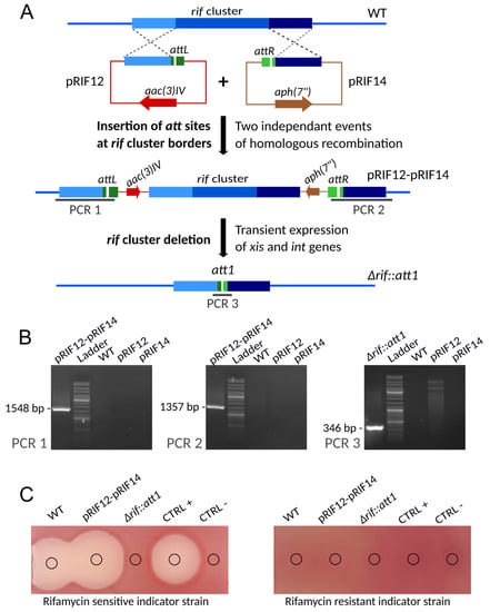 As previously described for rifK mutants, bacterial growth inhibition assay results confirmed that the ∆rif::att1 strains did not produce rifamycin, as shown in Figure 4C. The integration of pRIF12 and pRIF14 at the border of the cluster does not affect the production of rifamycin.