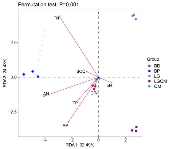 Figure 2. RDA results, including all of the examined soil physicochemical parameters. BD, Betula dahurica forest; BP, Betula platyphylla forest; LG, Larix gmelinii forest; LGQM, Q. mongolica and L. gmelinii mixed forest; QM, Quercus mongolica forest. TN, total nitrogen; SOC, soil organic carbon; TP, total phosphorous; AN, available nitrogen; AP, available phosphorous.