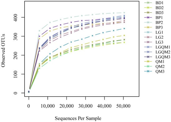 Figure 3. Rarefaction curves. BD1-BD3, B. dahurica; BP1-BP3, B. platyphylla; LG1-LG3, L. gmelinii; LGQM1-LGQM3, Q. mongolica and L. gmelinii mixed forest; QM1-QM3, Q. mongolica.