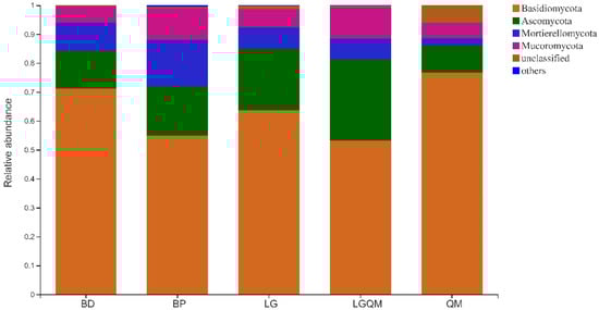 Figure 4. Effect of revegetation type on the relative abundance of fungal phyla. BD, Betula dahurica; BP, Betula platyphylla; LG, Larix gmelinii; LGQM, Q. mongolica and L. gmelinii mixed forest; QM, Quercus mongolica.