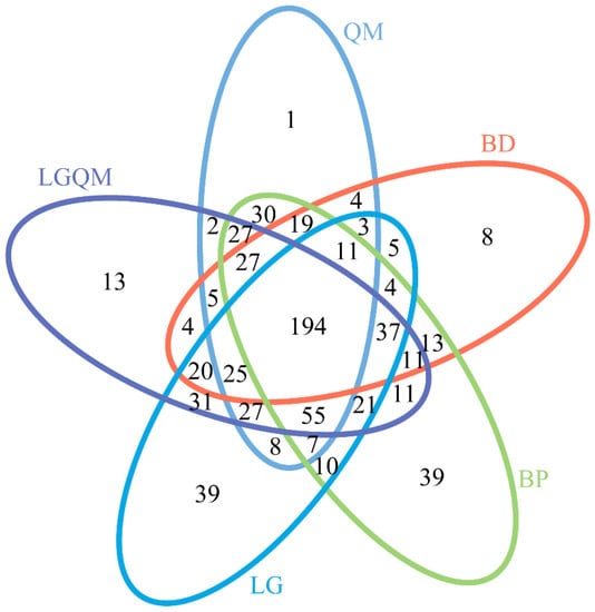 Figure 5. Venn diagram of shared and unique fungal OTUs among the vegetation types. BD, Betula dahurica; BP, Betula platyphylla; LG, Larix gmelinii; LGQM, Q. mongolica and L. gmelinii mixed forest; QM, Quercus mongolica.