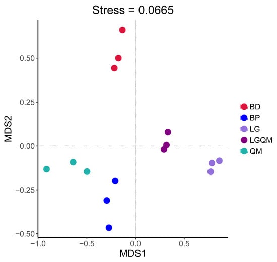 Figure 6. NMDS analysis of the fungal communities in the different forest type soils. BD, Betula dahurica; BP, Betula platyphylla; LG, Larix gmelinii; LGQM, Q. mongolica and L. gmelinii mixed forest; QM, Quercus mongolica.
