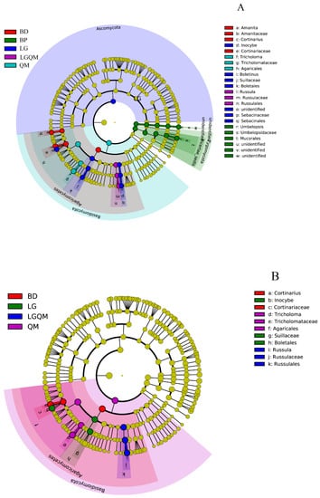 Figure 8. Cladogram of the fungal communities in the five types of forest soils with LDA > 4.5 (A) and >5.0 (B). The circles represent fungal taxa from phylum to genus starting from the center. BD, Betula dahurica; BP, Betula platyphylla; LG, Larix gmelinii; LGQM, Q. mongolica and L. gmelinii mixed forest; QM, Quercus mongolica.