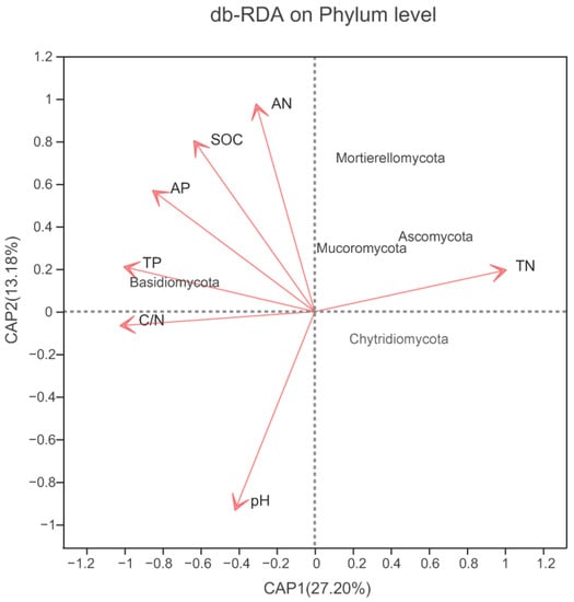 Figure 9. RDA of the dominant fungal phyla in soil constrained by soil variables.